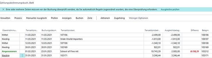 Unter Zahlungsmanagement > Zahlungsabstimmungsbuch.-Blätter können unbezahlte Belege automatisch mit den zugehörigen Banktransaktionen durch Importieren eines Bankauszuges abgestimmt werden.